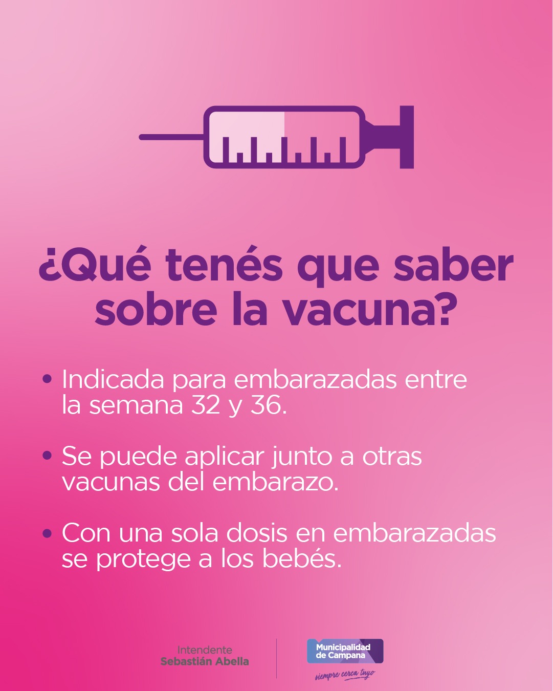 La Secretaría de Salud del Municipio informa que el 12 de enero de 2026 comenzará la vacunación contra el Virus Sincicial Respiratorio (VSR) a embarazadas de entre 32 y 36 semanas y 6 días