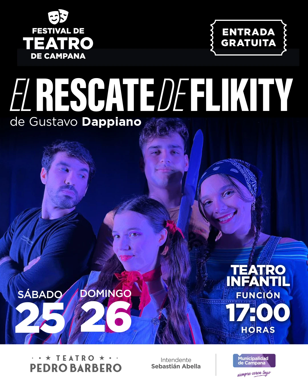 - Gustavo Dappiano: Presentará el infantil “El Rescate de Flikity” el sábado 25 y domingo 26 a las 17:00 hs en la sala del primer piso del Edificio 6 de Julio (San Martín 373).