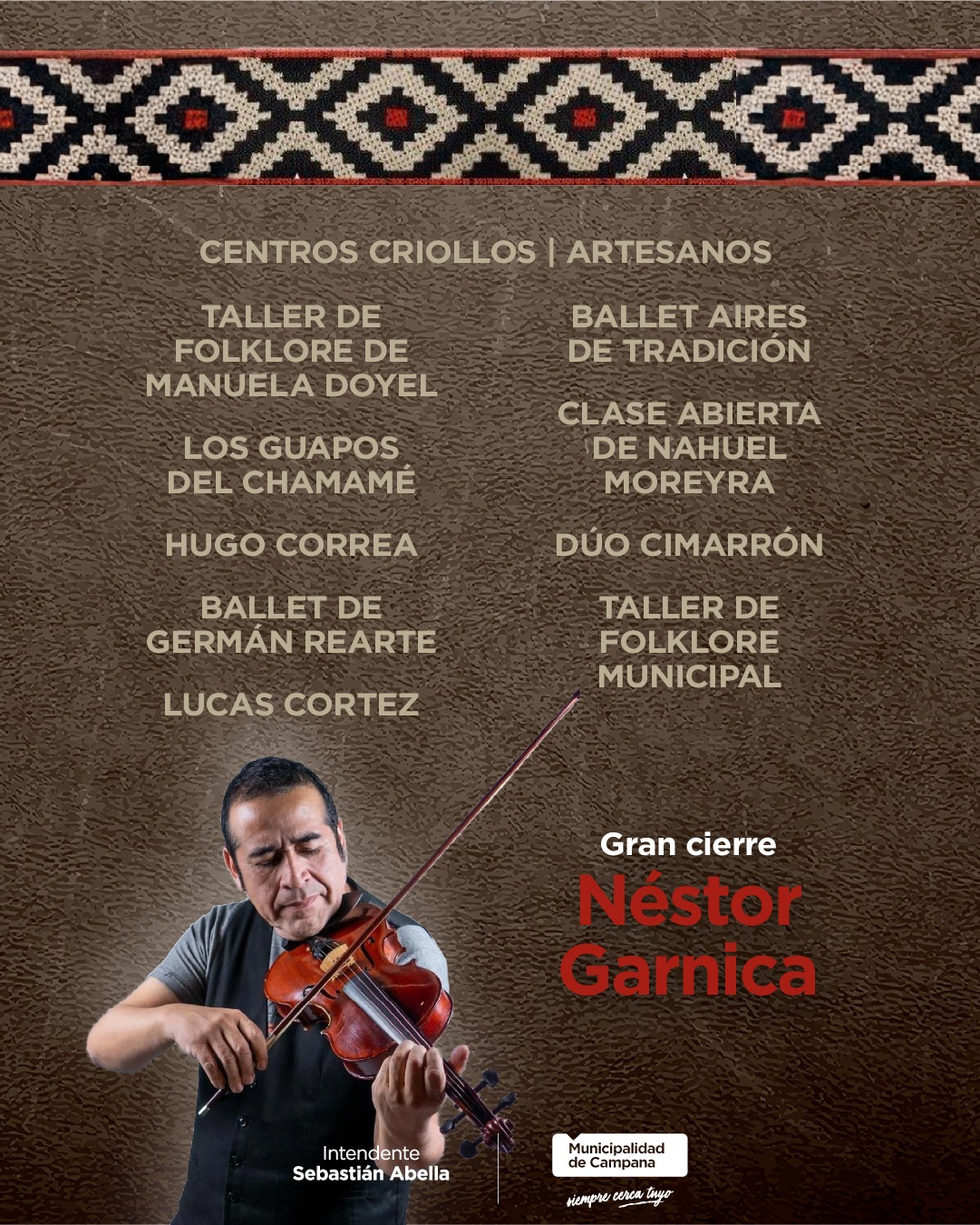 Los encargados de ponerle música a esta peña serán Hugo Correa, Lucas Cortez, Los guapos del chamamé y Dúo Cimarrón, mientras que el gran cierre estará a cargo de Néstor Garnica, uno de los artistas más reconocidos del folclore nacional, cuya presentación está prevista para las 19:30.