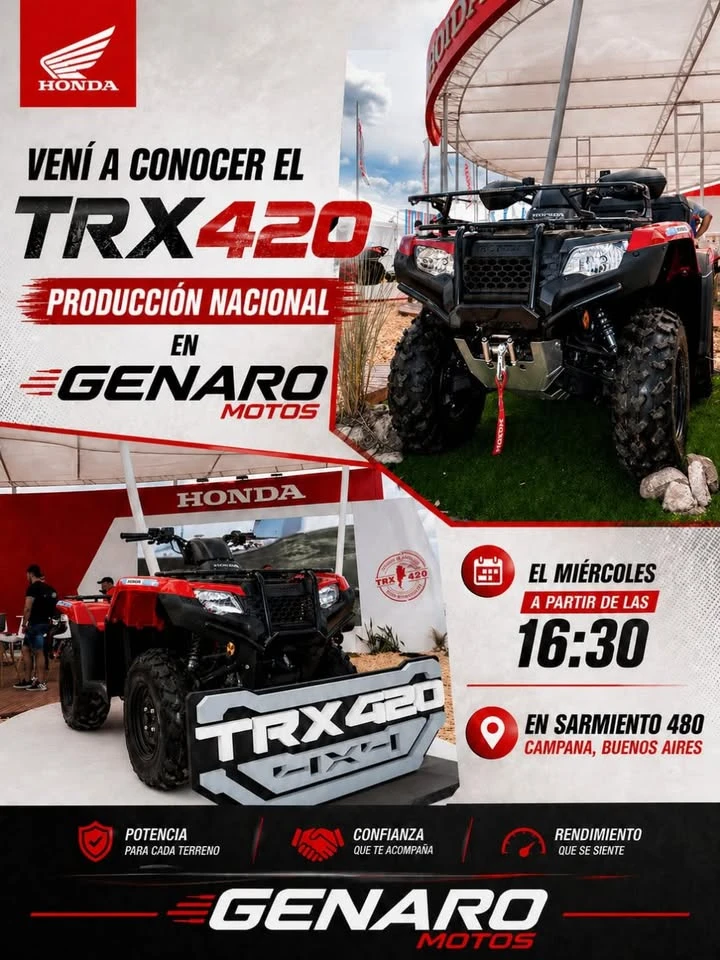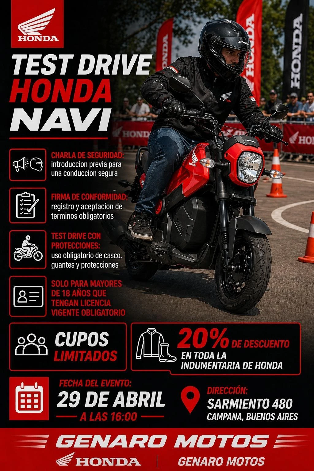 Genaro Motos presenta: Honda NAVI y el nuevo TRX420 nacional. La cita para los entusiastas de las dos y cuatro ruedas será este 29 de abril a las 16:00 horas en el local de Genaro Motos, ubicado en Sarmiento 480. La jornada comenzará con el Test Drive de la Honda NAVI, una experiencia de conducción que requiere inscripción previa debido a que los cupos son limitados.